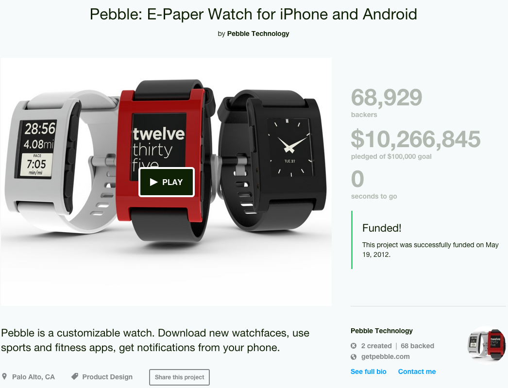 Το έξυπνο ρολόι pebble κατάφερε να πουλήσει το πρώτο εκατομμύριο κομμάτια το ίδιο γρήγορα με το πρώτο Apple iPod, με την διαφορά ότι το pebble σχεδιάστηκε από μια μικρή ομάδα και χρηματοδοτήθηκε από χιλιάδες δυνητικούς χρήστες, και όχι από επενδυτές που έχουν ως κίνητρο μόνο το κέρδος.